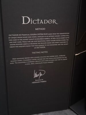 It is presented in a signature matte finish bottle with the large gold “Dictador” logo.