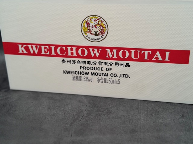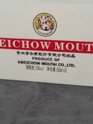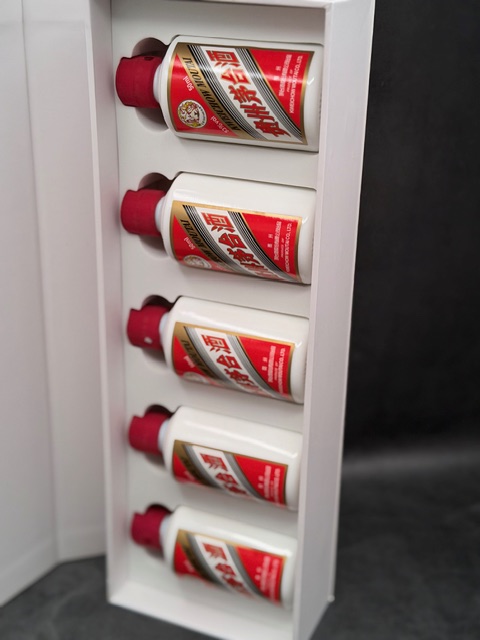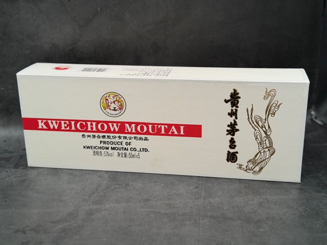 This is a presentation set containing five 50ml miniature bottles of the legendary Kweichow Moutai “Flying Fairy” (Feitian).
