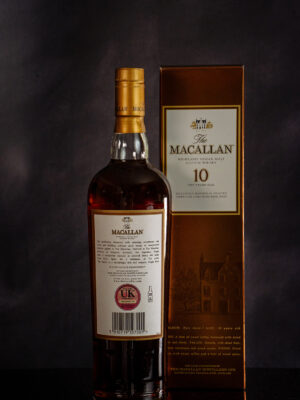 Old style box, getting much more rare, The Macallan Sherry Oak 10 Years Old forms part of our Sherry Oak range which features a series of single malt whiskies matured exclusively in hand-picked sherry seasoned oak casks from Jerez for richness and complexity. A matured character, the 12 Years Old delivers rich wood spice and dried fruits and a natural rich gold colour.