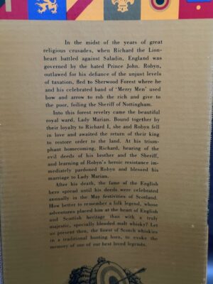 Historical Lore: The elaborate presentation box detail the legend of Robyn Hoode, Lady Marian, and the “Merry Men,” positioning this whisky as a celebration of English and Scottish heritage.
