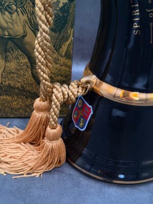 Unique Decanter Artistry: The bottle is a registered design produced in the U.K., featuring an elegant black glaze and a gold-colored hanging cord with decorative tassels.