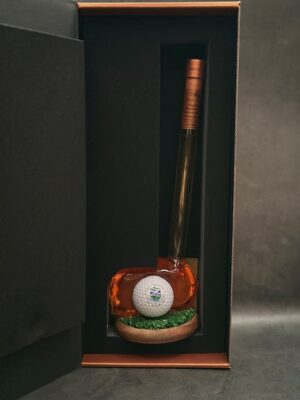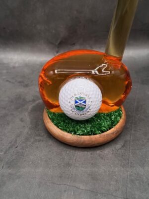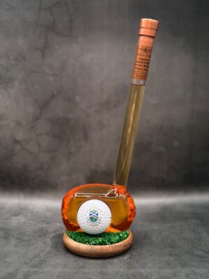 A glass golf club-shaped decanter of Highland scotch whisky by Stylish Whisky, complete with a golf ball, great prize for a Golf day!
